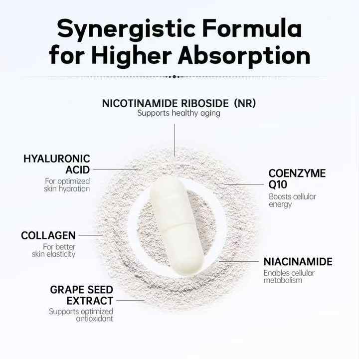 Answer 1: NAD+ (Nicotinamide Adenine Dinucleotide) is a vital coenzyme that helps with cellular repair and energy production. Its inclusion in our herbal supplements promotes skin elasticity, reduces the appearance of wrinkles, and enhances the overall radiance of your skin, helping you look and feel younger.
